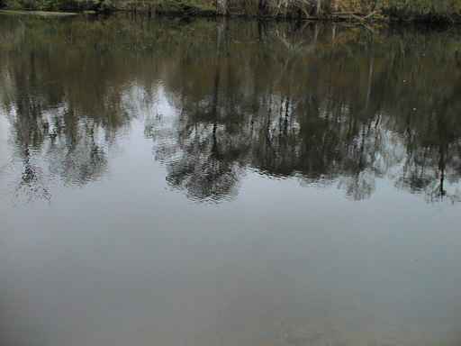 , reflecting the woods around it.